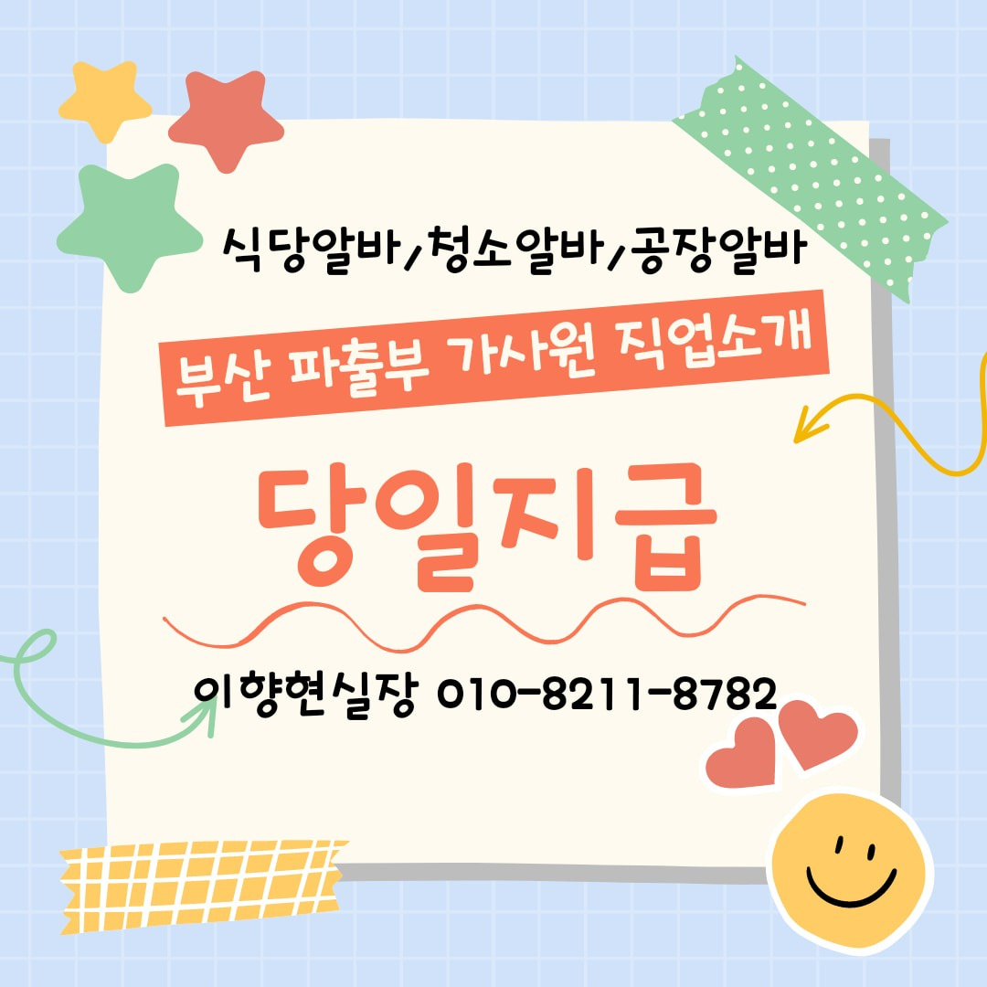 식당 #파출부 #청소 #가사도우미 #단체급식 #장사 #부산 #생산 #제조#가공#포장#식품#공장#가사#당일지급#일급#주급\월급\월급\월급\n크린\대형마트\회사\명절\음식점/직업/원룸/투룸/쓰리룸+가정집/이사,수산,농축산,시장,푸드,직업소개소,인력공급,택배,선물세트/부전시장/아르바이트/직원식당+파트내식당+식당+음식점+조리원+부산시내음식점+식당·식당+음식점·조리장·부산시내잡거실