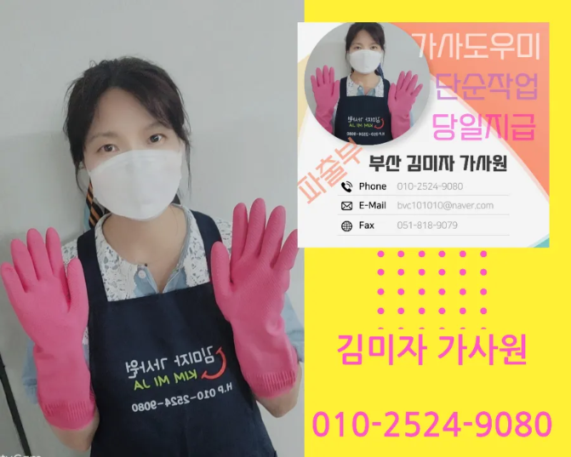 부산 김미자 가사원에서는 ♡식당(주방보조·홀서빙·단체급식) ♡청소(입주청소·대청소·이사청소) ♡가정(가사도우미·가정청소) ♡단순 알비 ♡공장도우미 경력자 우대